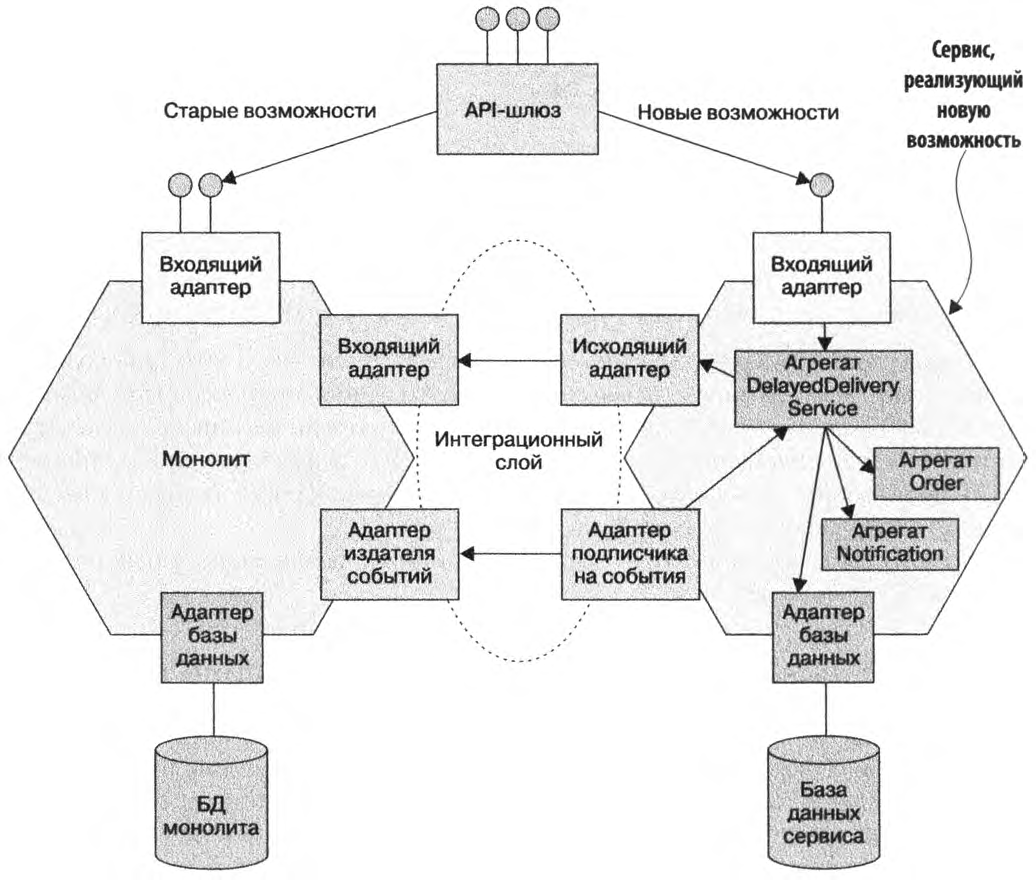 Архитектура приложения после реализации новой возможности в виде сервиса показана на рисунке. Помимо нового сервиса и монолита, она содержит два других компонента, которые интегрируют новый код в приложение: