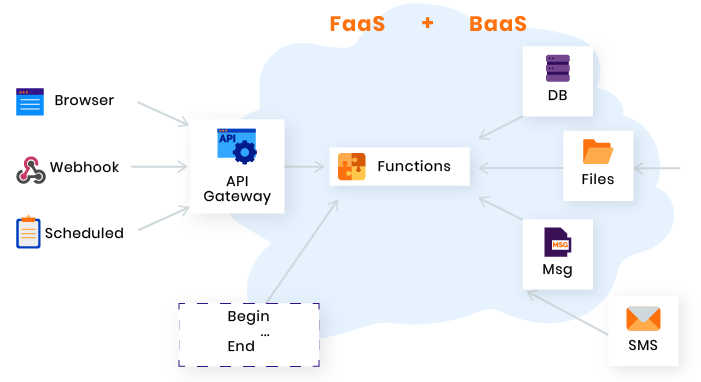 - FaaS (Function as a Service — функция как услуга) — модель облачных вычислений, которая позволяет разработчикам загружать части функционала в облако и позволяет этим частям выполняться независимо.