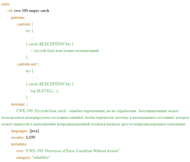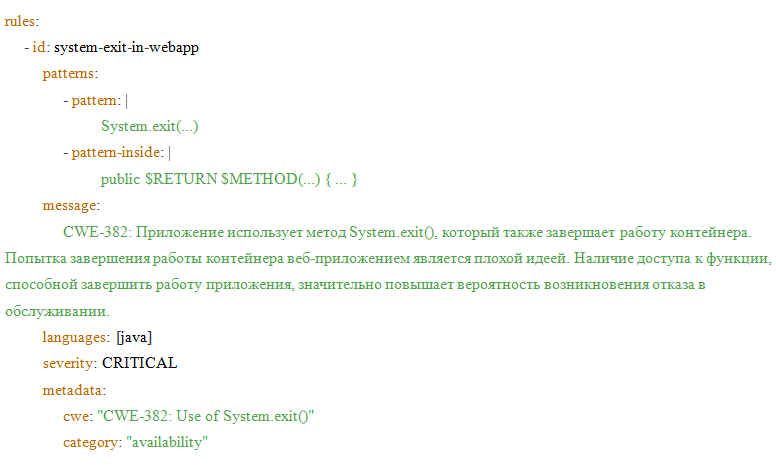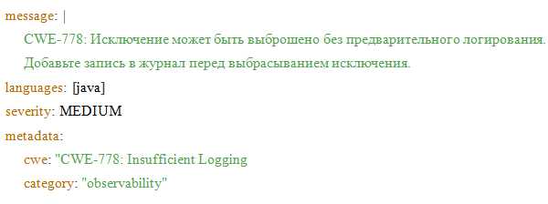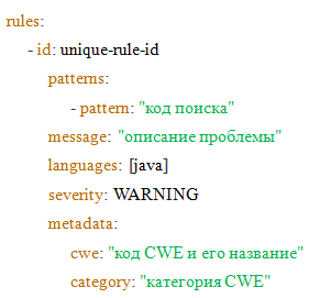 В правиле записывается уникальный id правила, шаблон поиска, описание проблемы, которое будет выведено в сообщение, при нахождении данной уязвимости. Также указывается язык программирования, уровень угрозы, код CWE и его категория.